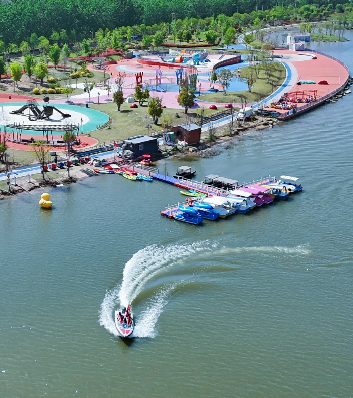 张集镇玉龙湖,游客坐着快艇在湖内驰骋。孙井贤摄